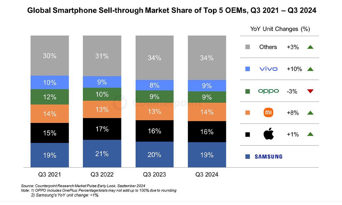 With almost 13% of the market, Chinese maker Xiaomi remained in third place, demonstrating the ongoing desire for its products, especially in areas with robust mid-range smartphone sales. Even while their volumes didn’t approach those of Apple or Samsung, other companies like Vivo and Oppo also helped the market as a whole grow.